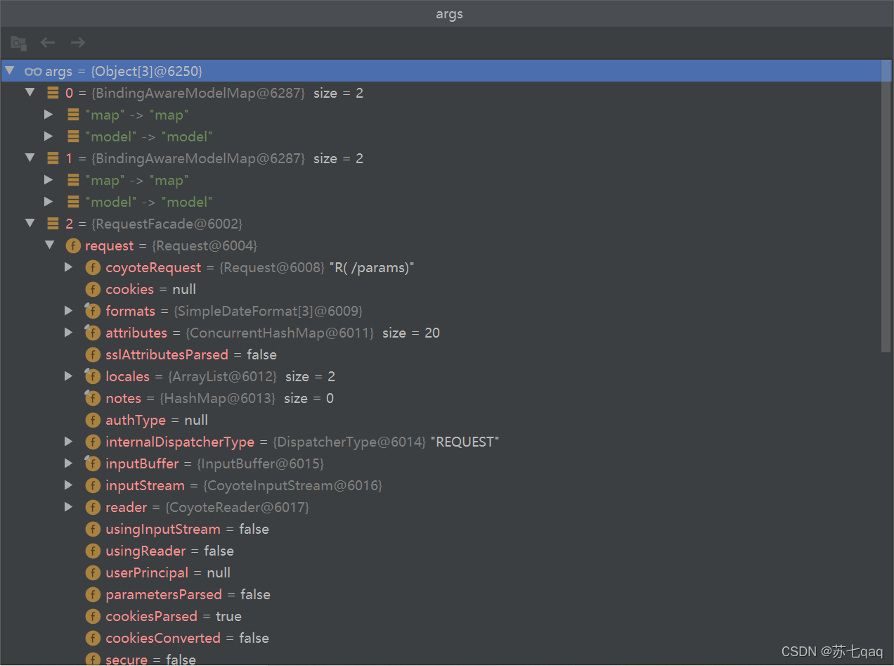 @GetMapping(value = "/params")public String goToPage(Model model,Map map,HttpServletRequest request){map.put("map","map");model.addAttribute("model","model");request.setAttribute("msg","springboot2");request.setAttribute("code","200");return "forward:/success";}@ResponseBody@GetMapping(value = "/success")public Map success(@RequestAttribute(value = "msg",required = false)String msg,@RequestAttribute(value = "code",required = false)Integer code,HttpServletRequest request//与goToPage方法中的参数同样一个request){Map map = new HashMap<>();Object code1 = request.getAttribute("code");Object map1 = request.getAttribute("map");Object model = request.getAttribute("model");map.put("msg",msg);map.put("code1",code1);//利用requerst域获得的codemap.put("code",code);//利用注解@RequestAttribute获得的codemap.put("map1",map1);map.put("model",model);return map;}