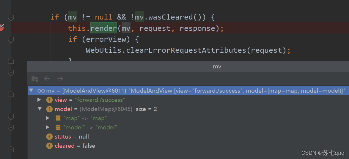 public class DispatcherServlet extends FrameworkServlet {...protected void doDispatch(HttpServletRequest request, HttpServletResponse response) throws Exception {...try {ModelAndView mv = null;...// Actually invoke the handler.mv = ha.handle(processedRequest, response, mappedHandler.getHandler());...}catch (Exception ex) {dispatchException = ex;}catch (Throwable err) {// As of 4.3, we're processing Errors thrown from handler methods as well,// making them available for @ExceptionHandler methods and other scenarios.dispatchException = new NestedServletException("Handler dispatch failed", err);}//处理分发结果processDispatchResult(processedRequest, response, mappedHandler, mv, dispatchException);}...}private void processDispatchResult(HttpServletRequest request, HttpServletResponse response,@Nullable HandlerExecutionChain mappedHandler, @Nullable ModelAndView mv,@Nullable Exception exception) throws Exception {...// Did the handler return a view to render?if (mv != null && !mv.wasCleared()) {render(mv, request, response);...}...}protected void render(ModelAndView mv, HttpServletRequest request, HttpServletResponse response) throws Exception {...View view;String viewName = mv.getViewName();//获取要转发的视图名if (viewName != null) {// We need to resolve the view name.view = resolveViewName(viewName, mv.getModelInternal(), locale, request);//解析视图if (view == null) {throw new ServletException("Could not resolve view with name '" + mv.getViewName() +"' in servlet with name '" + getServletName() + "'");}}else {// No need to lookup: the ModelAndView object contains the actual View object.view = mv.getView();if (view == null) {throw new ServletException("ModelAndView [" + mv + "] neither contains a view name nor a " +"View object in servlet with name '" + getServletName() + "'");}}view.render(mv.getModelInternal(), request, response);...}}