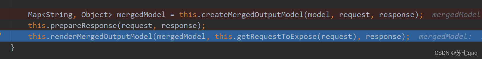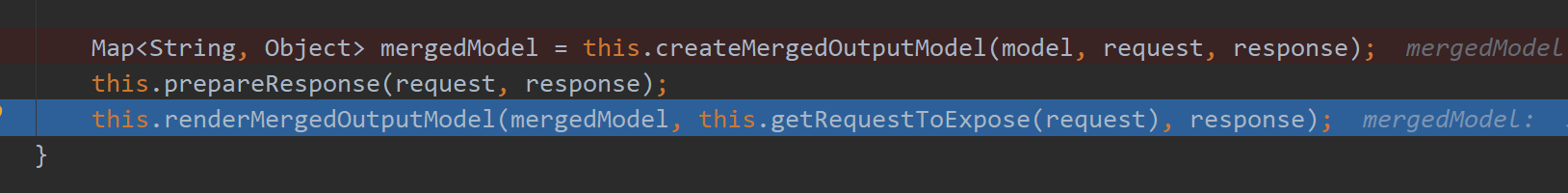 public void render(@Nullable Map model, HttpServletRequest request, HttpServletResponse response) throws Exception {if (this.logger.isDebugEnabled()) {this.logger.debug("View " + this.formatViewName() + ", model " + (model != null ? model : Collections.emptyMap()) + (this.staticAttributes.isEmpty() ? "" : ", static attributes " + this.staticAttributes));}Map mergedModel = this.createMergedOutputModel(model, request, response);this.prepareResponse(request, response);this.renderMergedOutputModel(mergedModel, this.getRequestToExpose(request), response);}