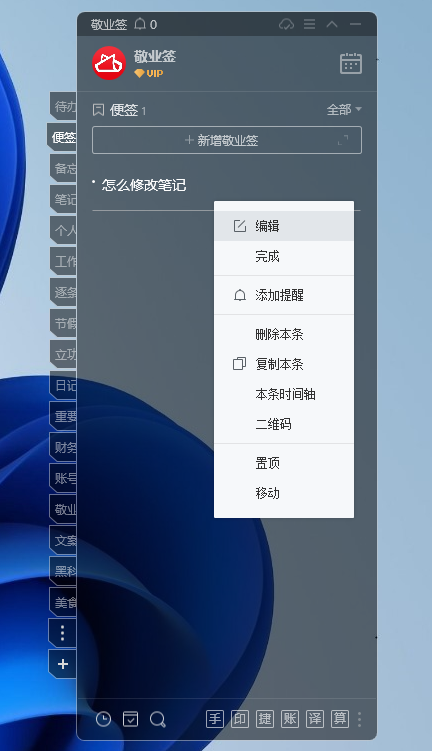 2、如果想要修改此条笔记内容的话,那么用鼠标右键单击一下它,这时会弹出一个下拉菜单,在下拉菜单中有很多不同功能的选项,点击选择【编辑】这个选项。