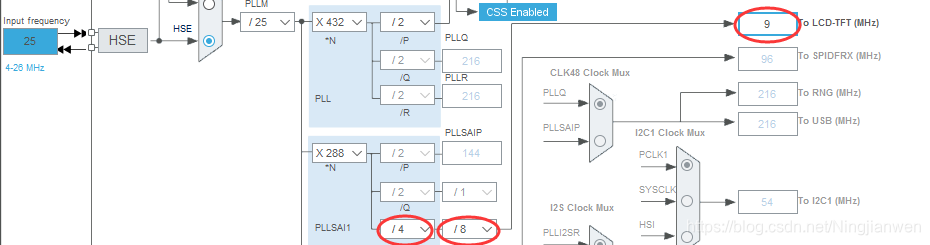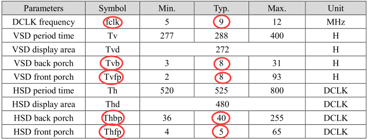 通过数据手册得知时钟范围为5~12MHz,典型为9MHz,所以LCD-TFT时钟配置如下: