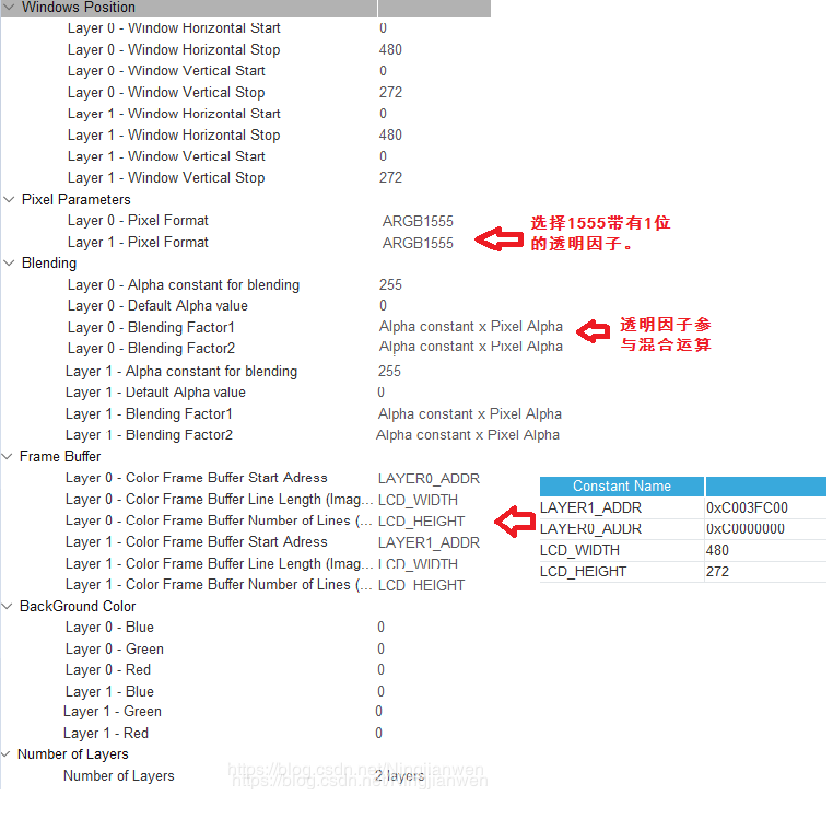 RGB LCD可以配置两层,一般情况下Layer1作为前景层,Layer0作为背景层,需要知道的是这里的两层是软件层面上的,硬件上LCD只有一层,最终显示时,是将两层数据进行混合形成一层数据,再发送给LCD进行显示。