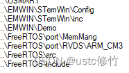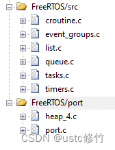 关于这一部分,可以参考野火关于FreeRTOS移植的教程,本人对于FreeRTOS的学习是参考野火的教程完成的。开头已经在例程模板中建了两个文件夹:FreeRTOS/src,FreeRTOS/port。我们要在这两个文件夹中添加需要移植的文件如下: