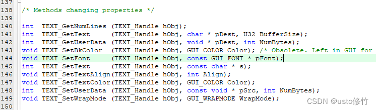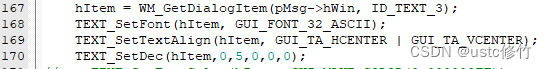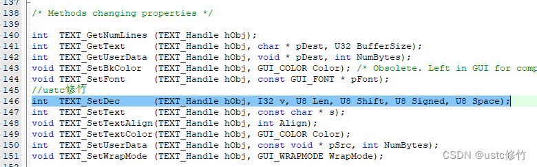 如图5.1所示,这是笔者本人自己编写的一段代码,主要在文本控件里面实现一个数值显示功能。如果使用第170行的TEXT_SetDec函数,会发现可以编译而且烧录了可以使用,但是编译会出现警告,原因在于TEXT.h中并没有声明这个函数,所以在TEXT.h中声明一下这个函数,编译以后警告就会消失。