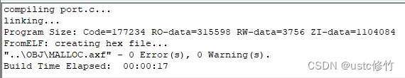 malloc.h中第31行,一般默认是40*1024,我们需要修改一下,一般根据经验修改成20*1024即可正常编译。最后的编译结果如图4.2:
