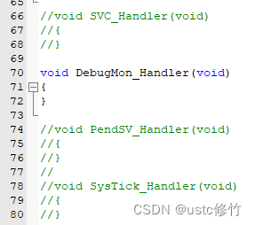 关于系统时钟的开启,由于我们用得是正点原子得delay.c文件,所以我们要stm32f10x_it.c文件得部分代码修改一下。把三个中断在这个文件注释掉:SVC_Handler,PendSV_Handler,SysTick_Handler。其中前两个函数FreeRTOS已经为用户实现了,而正点原子的在delay.c中实现了第三个函数,所以全部注释即可,如图3.2所示:
