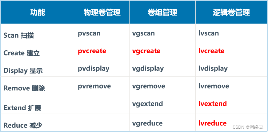 - 卷组管理:vgscan、vgcreate、vgdisplay、vgremove、vgextend、vgreduce