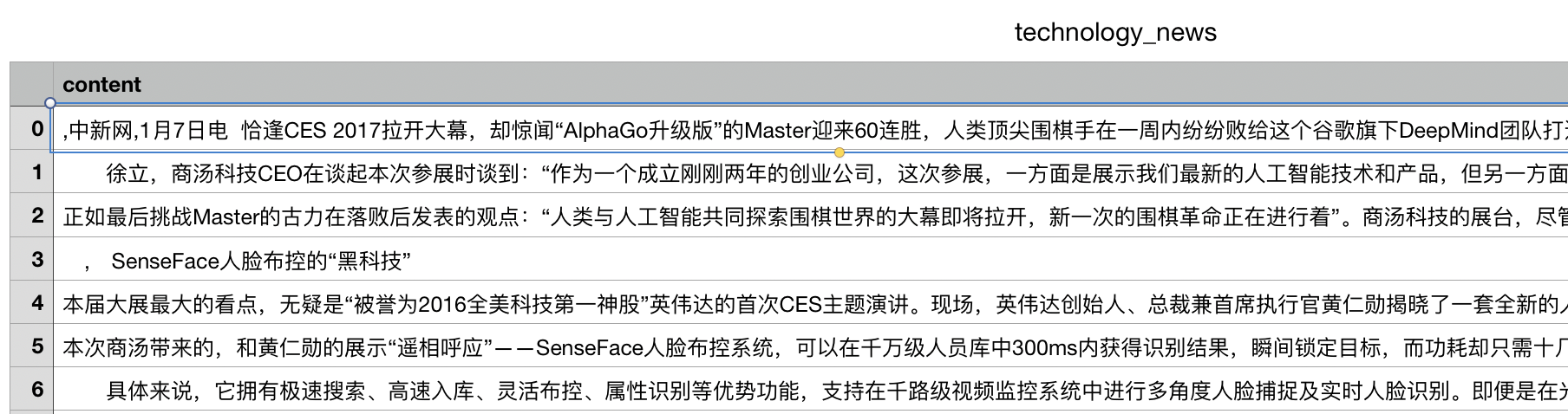 import randomcate_dic = {'technology':1, 'car':2, 'entertainment':3, 'military':4, 'sports':5}df_technology = pd.read_csv("./origin_data/technology_news.csv", encoding='utf-8')