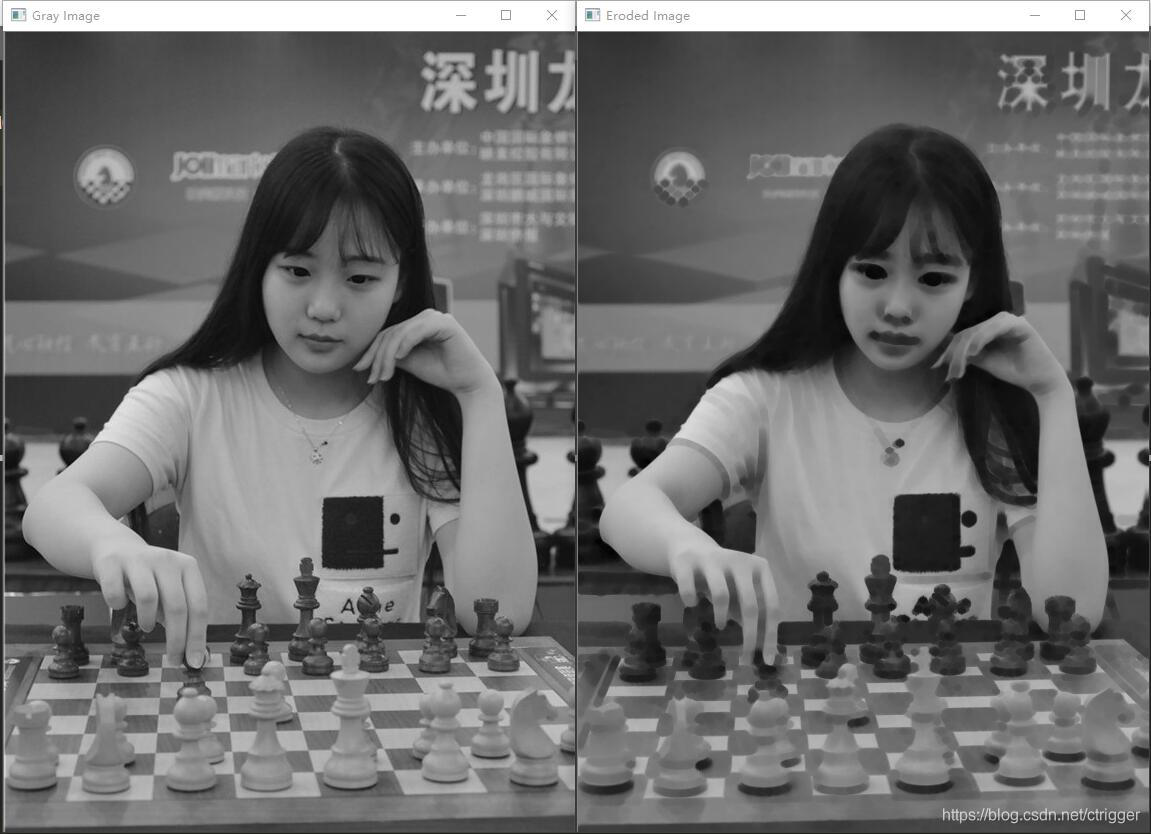 #!/usr/bin/env python3import cv2image = cv2.imread(r"meishaonv.jpg") gray = cv2.cvtColor(image, cv2.COLOR_BGR2GRAY) cv2.imshow("Gray Image", gray)kernel = cv2.getStructuringElement(cv2.MORPH_ELLIPSE, (7,7)) eroded = cv2.erode(gray.copy(), kernel, 10) # eroded = cv2.erode(gray.copy(), None, 10)cv2.imshow("Eroded Image", eroded)cv2.waitKey(0) cv2.destroyAllWindows()