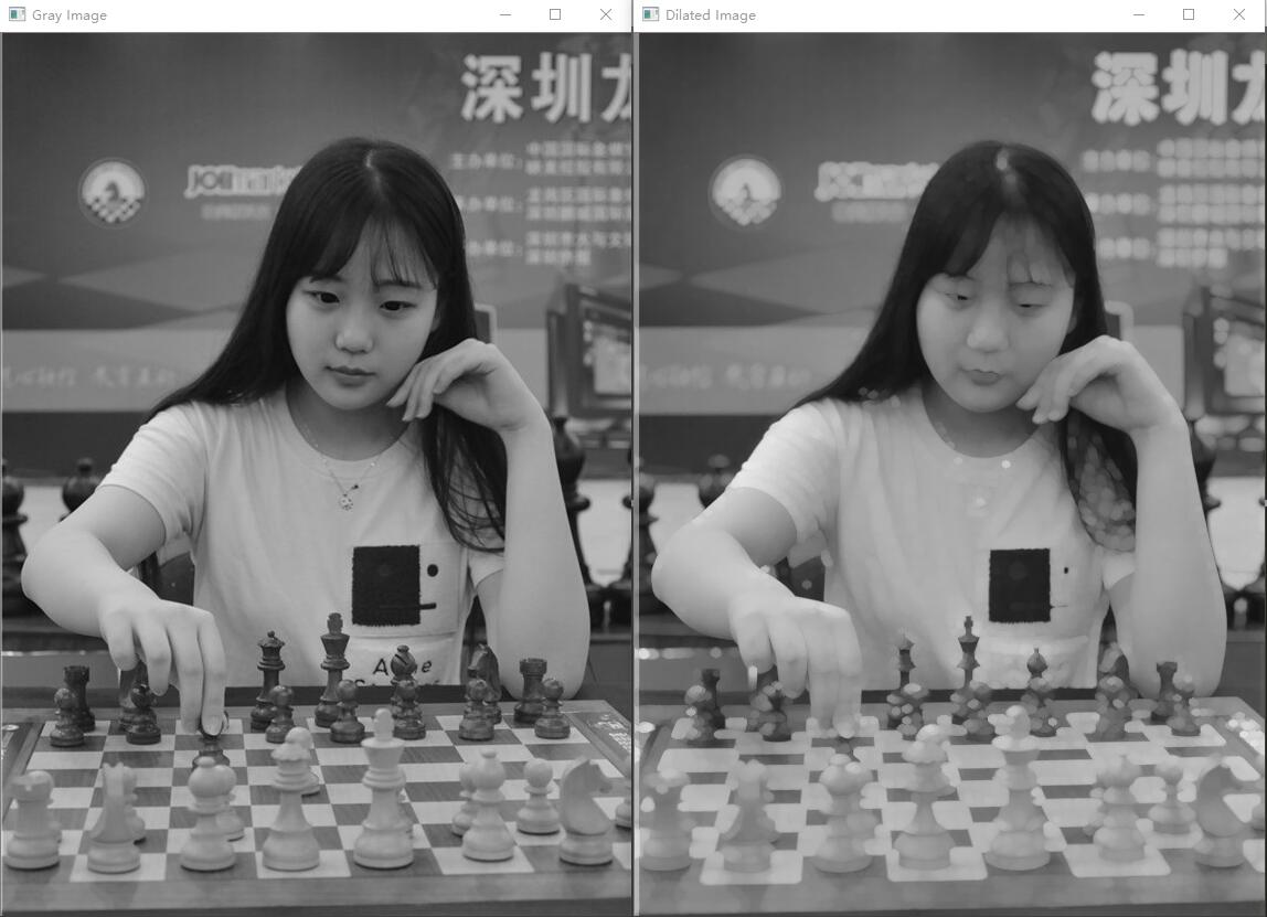 #!/usr/bin/env python3import cv2image = cv2.imread(r"meishaonv.jpg") gray = cv2.cvtColor(image, cv2.COLOR_BGR2GRAY) cv2.imshow("Gray Image", gray)kernel = cv2.getStructuringElement(cv2.MORPH_ELLIPSE, (7,7)) dilated = cv2.dilate(gray.copy(), kernel, 10) # dilated = cv2.dilate(gray.copy(), None, 10)cv2.imshow("Dilated Image", dilated)cv2.waitKey(0) cv2.destroyAllWindows()