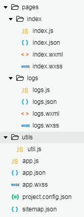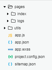 注意到,第一级文件为pages文件夹、utils文件夹、app.js、app.json、app.wxss、project.config.json、sitemap.json