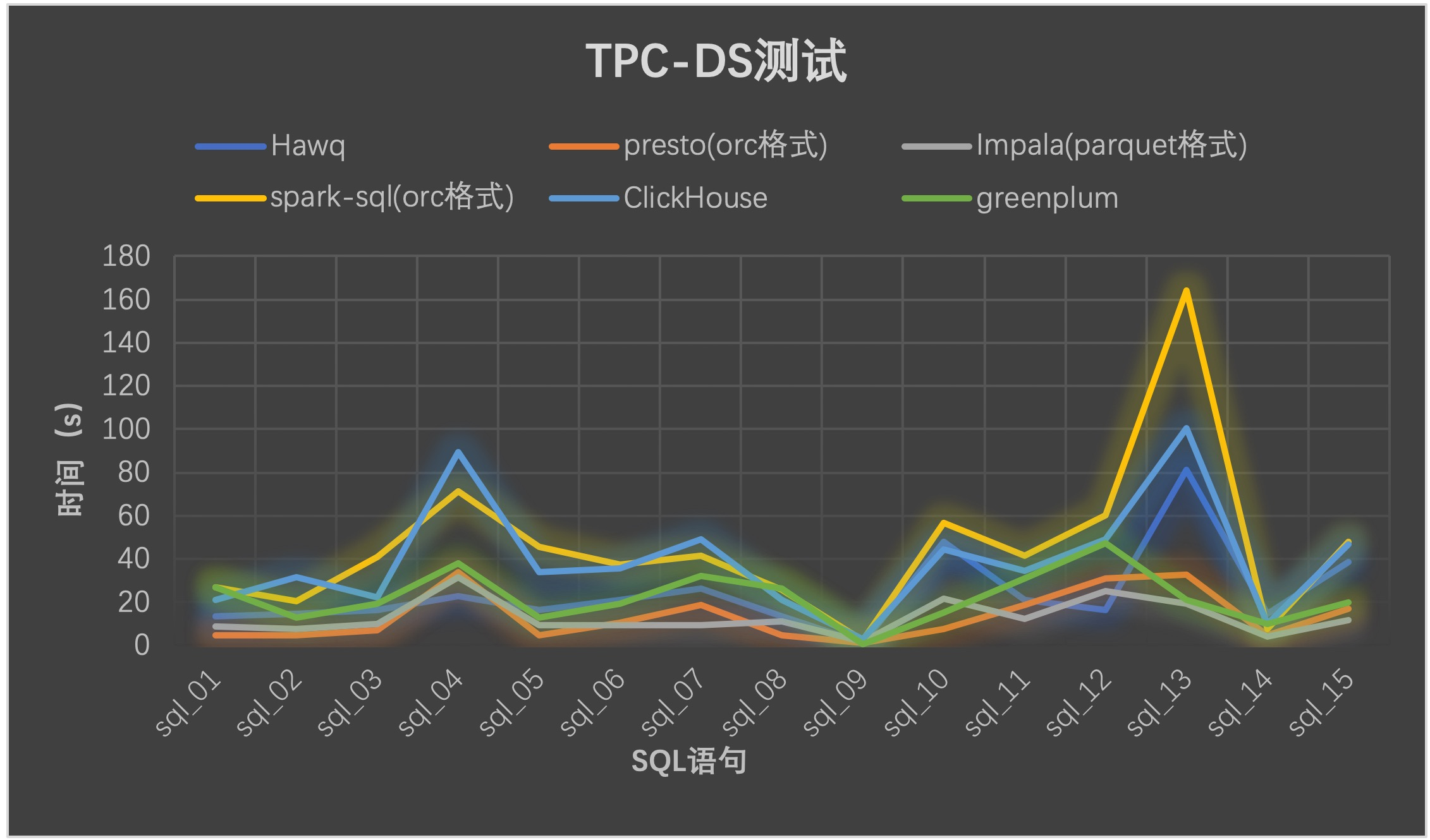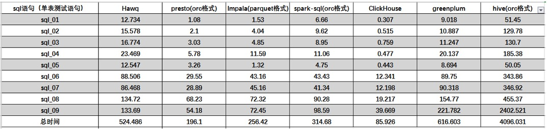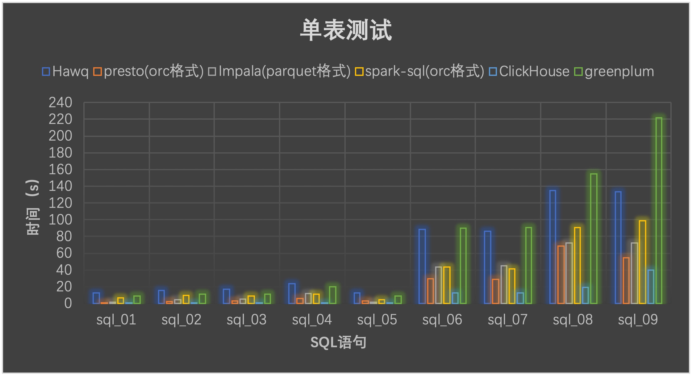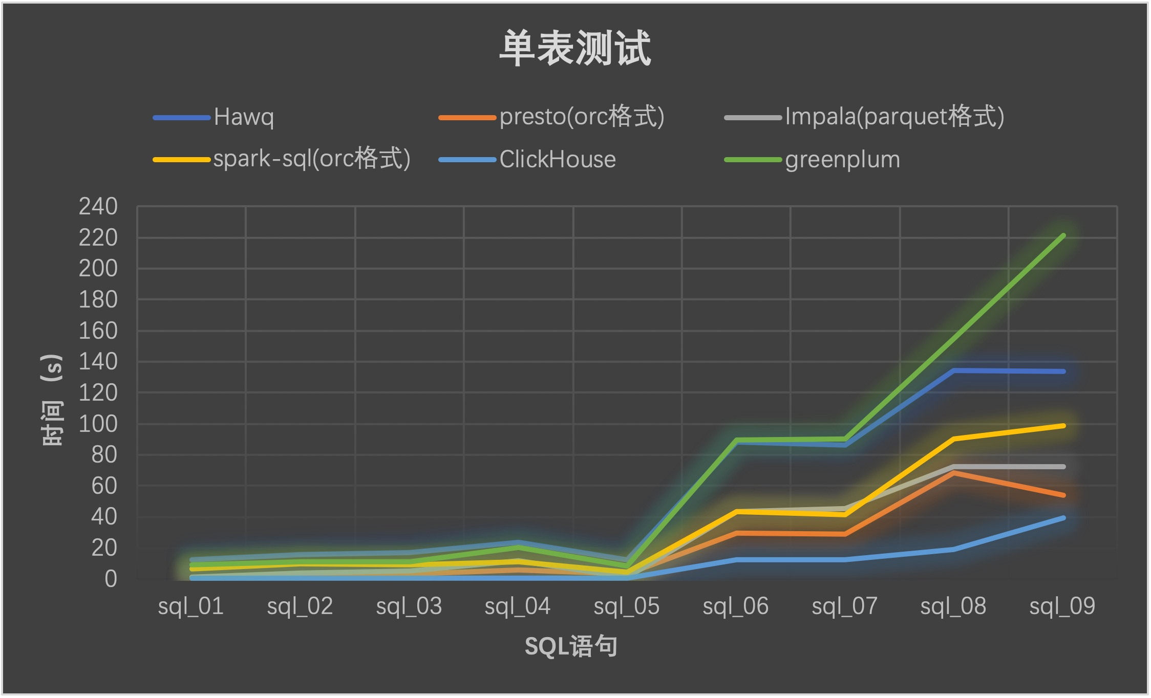 本节通过查询语句对比SparkSql、Presto、Impala、HAWQ、ClickHouse、Hive、GreenPlum七种组件的查询性能,测试结果均采用连续三次查询结果的平均值,通过图表展示对比结果。