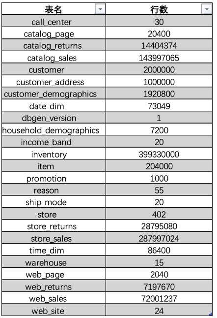 TPC-DS采用星型、雪花型等多维数据模式。它包含7张事实表,17张维度表平均每张表含有18列。其工作负载包含99个SQL查询,覆盖SQL99和2003的核心部分以及OLAP。这个测试集包含对大数据集的统计、报表生成、联机查询、数据挖掘等复杂应用,测试用的数据和值是有倾斜的,与真实数据一致。可以说TPC-DS是与真实场景非常接近的一个测试集,也是难度较大的一个测试集。