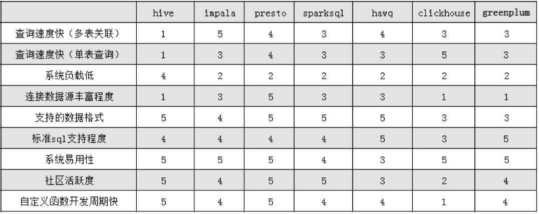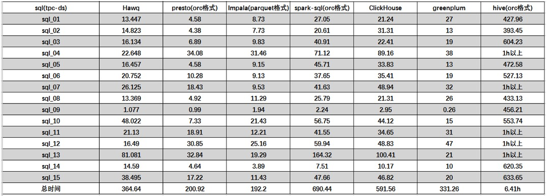 通过我们选取的15条sql语句查询测试,从表中可以看出,presto、impala和hawq查询时间快于SparkSql和ClickHouse,性能约是SparkSql的2-3倍,其中尤其以Presto和Impala性能要好一些。greenplum在多表查询上也有不错的表现;ClickHouse对于多表join效果相比较于Presto、Impala、HAWQ不是很好,并且很多复杂语法支持的不够好,可见并不是为关联分析而设置;而hive无疑是所有组件中耗时最多的,其中部分语句查询时间超出1h的总时间按1h计算。