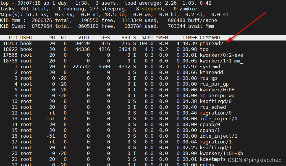 3.6 用另一个终端执行命令:top ,发现在前根本看不到pthread3,说明优化后基本不占CPU资源