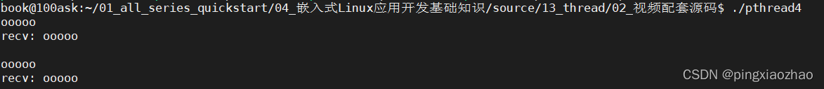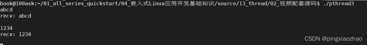 {pthread_t tid;int ret;char buf[1000];sem_init(&g_sem, 0, 0);//1. 创建"接收线程" ret = pthread_create(&tid, NULL, my_thread_func, NULL);if (ret){printf("pthread_create err!\n");return -1;}//2. 主线程读取标准输入, 发给"接收线程" while (1){fgets(buf, 1000, stdin);pthread_mutex_lock(&g_tMutex);memcpy(g_buf, buf, 1000);pthread_mutex_unlock(&g_tMutex);// 通知接收线程 sem_post(&g_sem);}return 0;