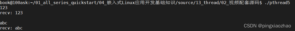 {pthread_t tid;int ret;char buf[1000];//1. 创建"接收线程" ret = pthread_create(&tid, NULL, my_thread_func, NULL);if (ret){printf("pthread_create err!\n");return -1;}//2. 主线程读取标准输入, 发给"接收线程" while (1){fgets(buf, 1000, stdin);pthread_mutex_lock(&g_tMutex);memcpy(g_buf, buf, 1000);pthread_cond_signal(&g_tConVar); //通知接收线程 pthread_mutex_unlock(&g_tMutex);}return 0;