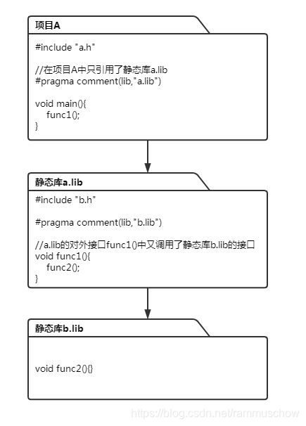 例如项目A中调用了静态库a.lib的对外接口func1(),而a.lib中的接口func1()又引用了静态库b.lib中的func2(),但是项目A只引用了a.lib,导致func2()符号无法解析。示意图如下: