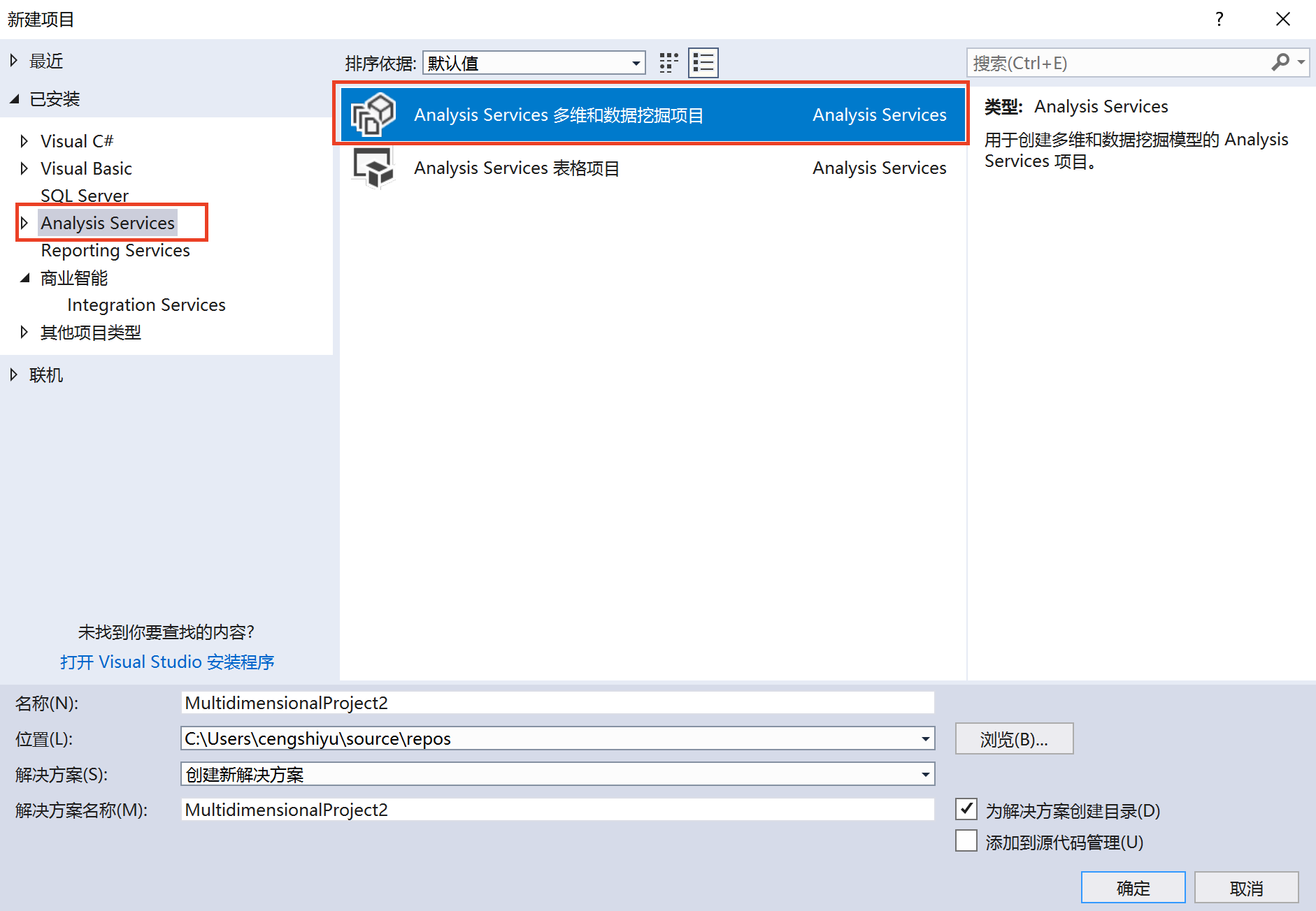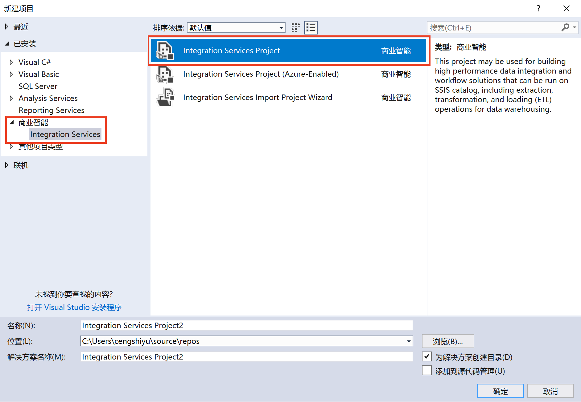 3、选择“商业智能”的“Integration Services”的“Integration Services Project”,可以改个名称,确定
