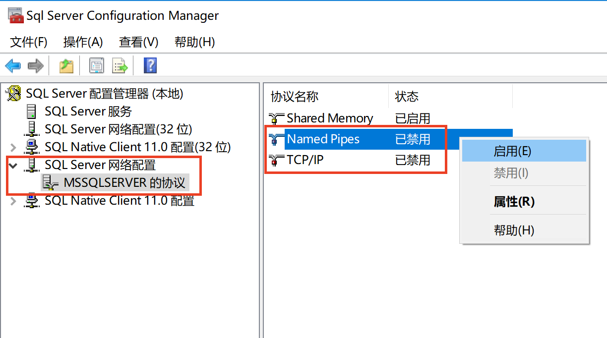 5、找到“SQL Server 网络配置”的“MSSQLSERVER的协议”,把右边两个禁用的都给启用。