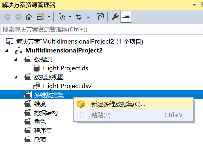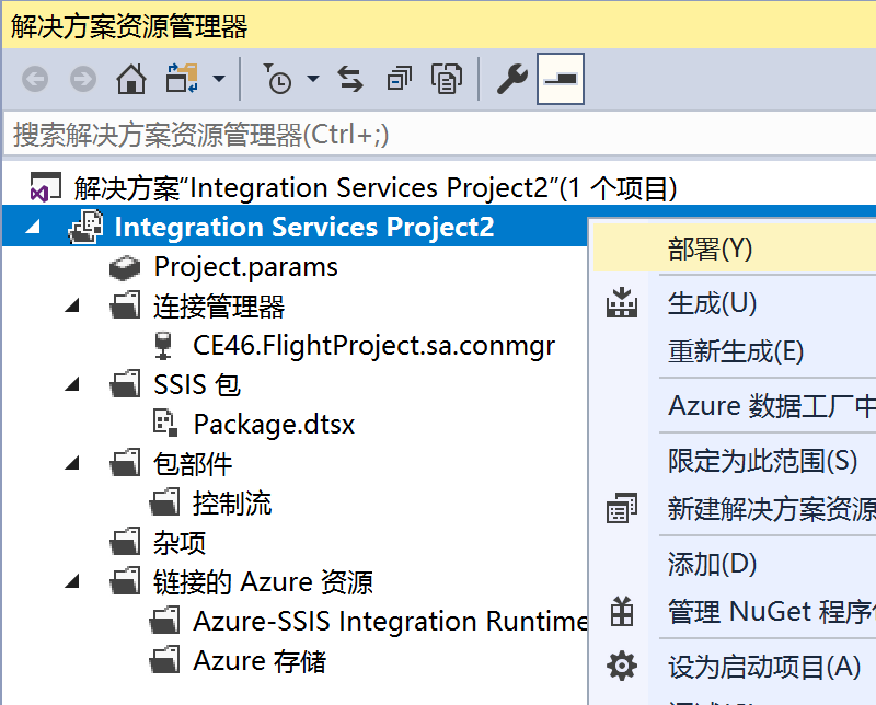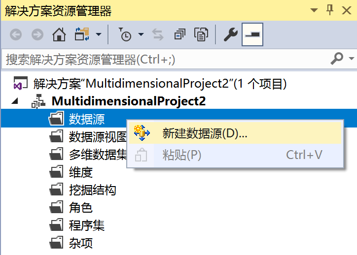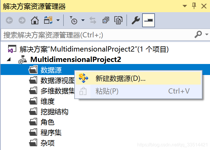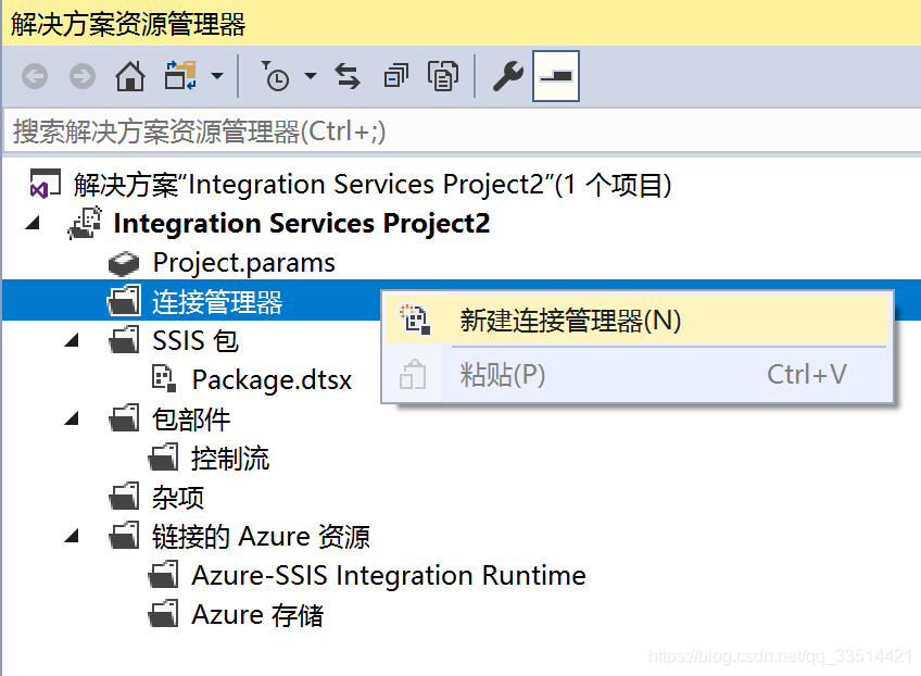 6、回到SSIS项目,找到右上角的“解决方案资源管理器”,右键“连接管理器”,“新建连接管理器”