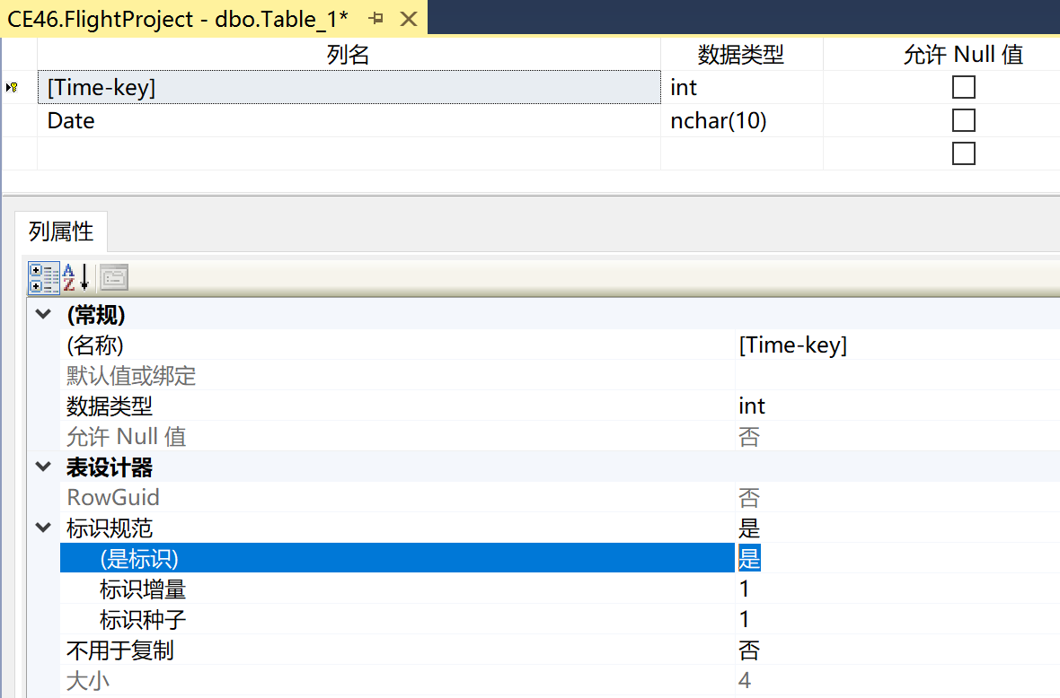 8、为了让主键自增,修改“标识规范”的“(是标识)”为是,回车