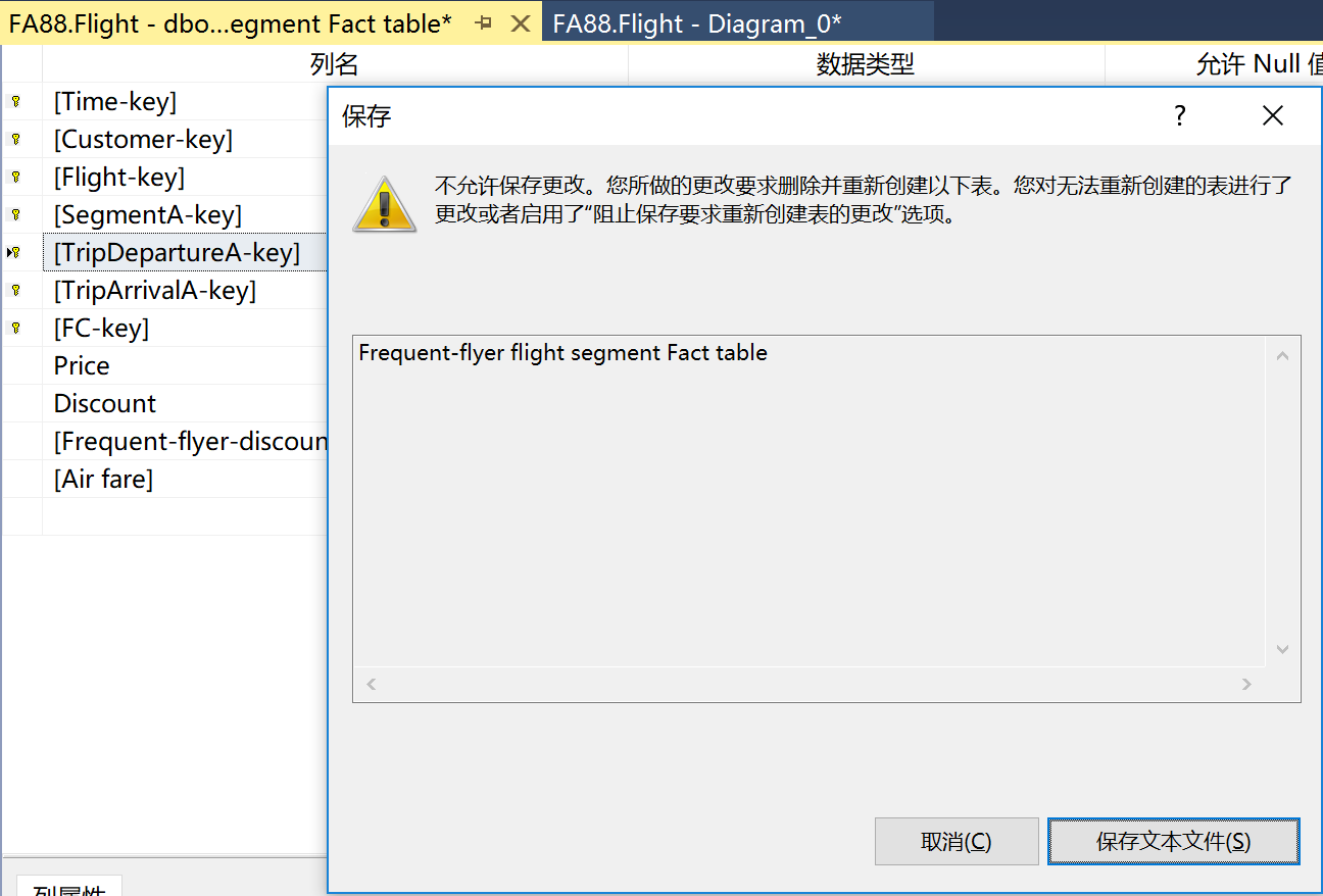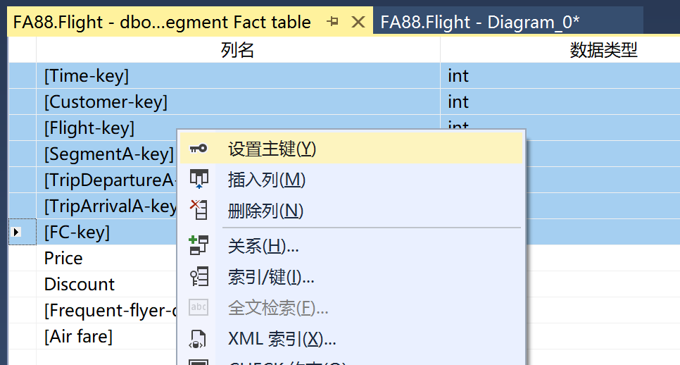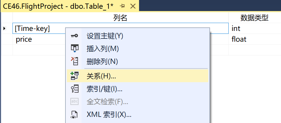 10、以事实表为例,创建Time-key和Price两列,要设置Time-key为外键,右键Time-key,选择“关系”,