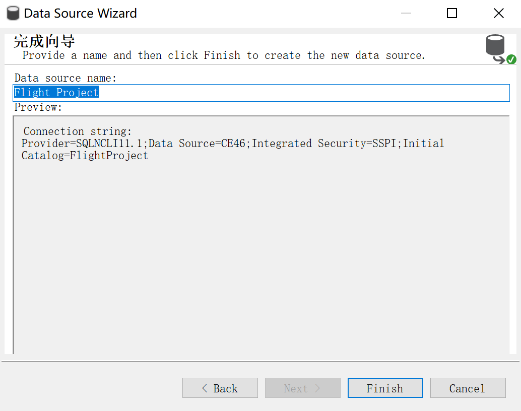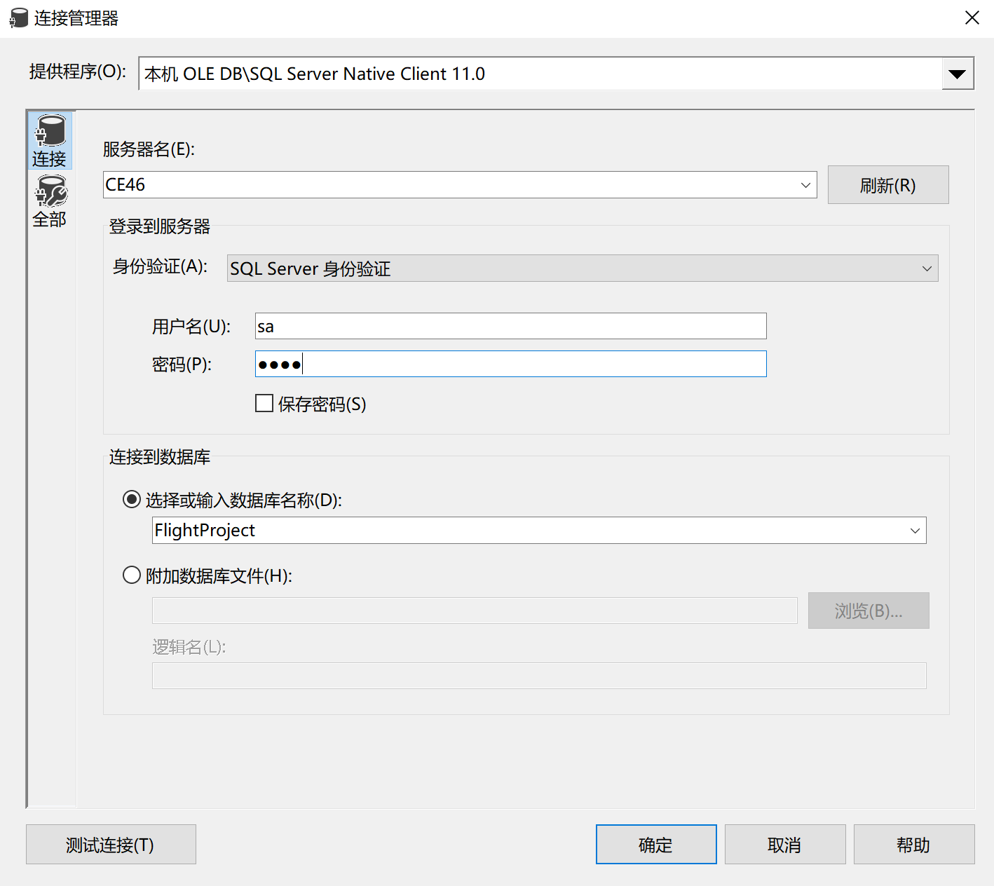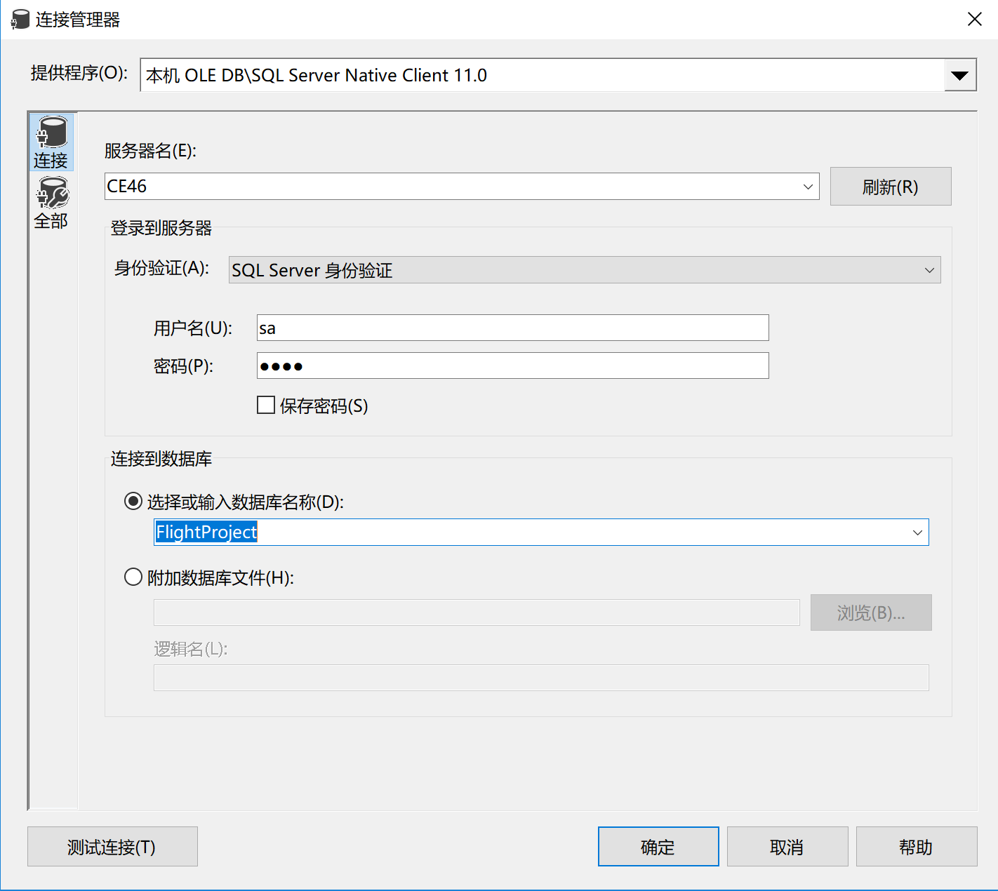 9、服务器名就是SSMS登陆的时候那个名称,身份验证改成“SQL Server 身份验证”,用户名为“sa”,密码是安装SQL Server自己设置的密码,选择第一步建好的数据库。测试连接,成功!