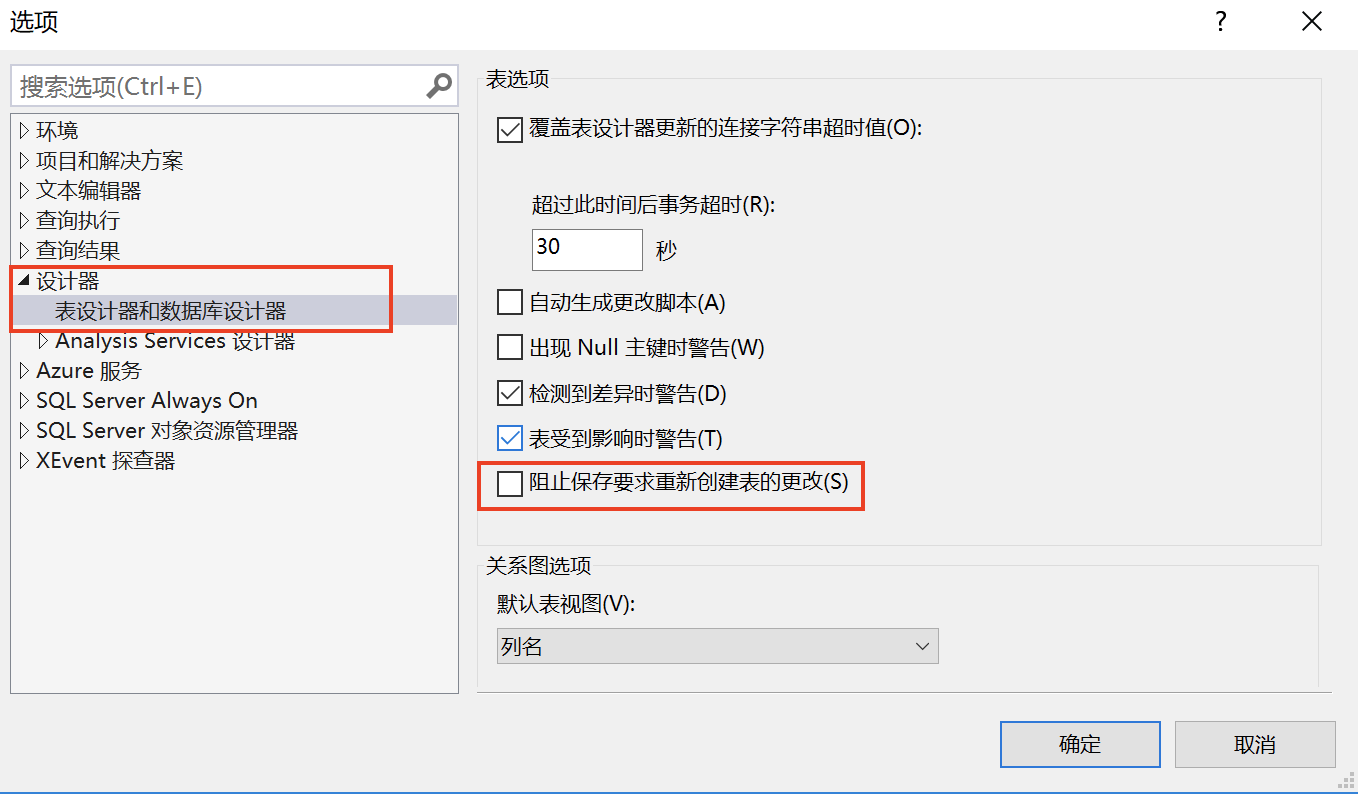 点“设计器”-“表设计器和数据库设计器”,把“阻止保存要求重新创建表的更改”的给取消勾选。