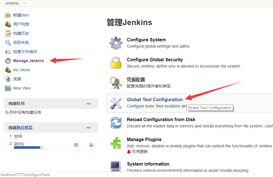 然后登陆jenkins的后台管理: Manage Jenkins -> Global Tool Configuration 选择自己的配置文件