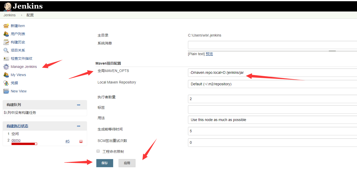 windows默认在 C:\Users\用户名\.m2 下,会比较大,所以这里修改一下路径,使用jenkins的后台管理: Manage Jenkins -> Configure System -> Maven项目配置 -> 全局MAVEN_OPTS 输入 -Dmaven.repo.local=D:/jenkins/jar 自定义路径即可