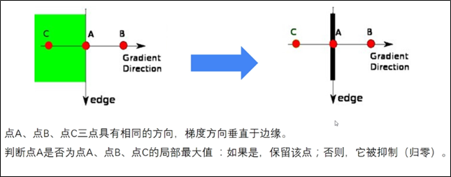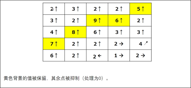 2)比较该像素点和其梯度正负方向的像素点的梯度强度,如果该像素点梯度强度最大则保留,否则抑制(删除,即置为0)。