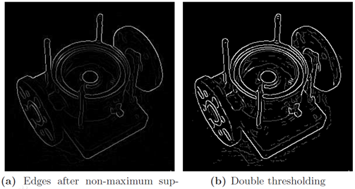 对于每个像素点,它进行如下操作:应用非最大抑制技术来过滤掉非边缘像素,将模糊的边界变得清晰。该过程保留了每个像素点上梯度强度的极大值,过滤掉其他的值。