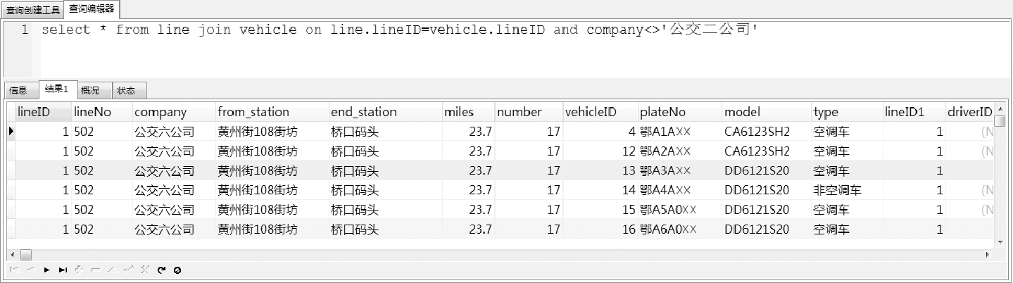 案例2:使用内连接获取不属于公交二公司的线路信息和车辆信息。