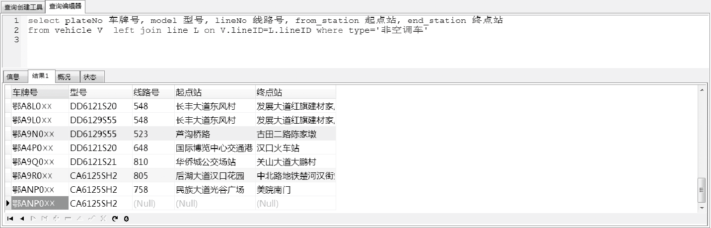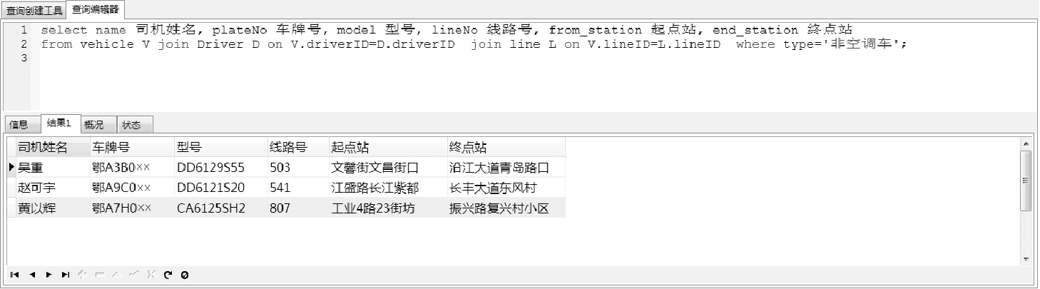 案例:获取所有非空调车的车牌号、型号和司机姓名、所属线路的线路号、起点站和终点站信息。