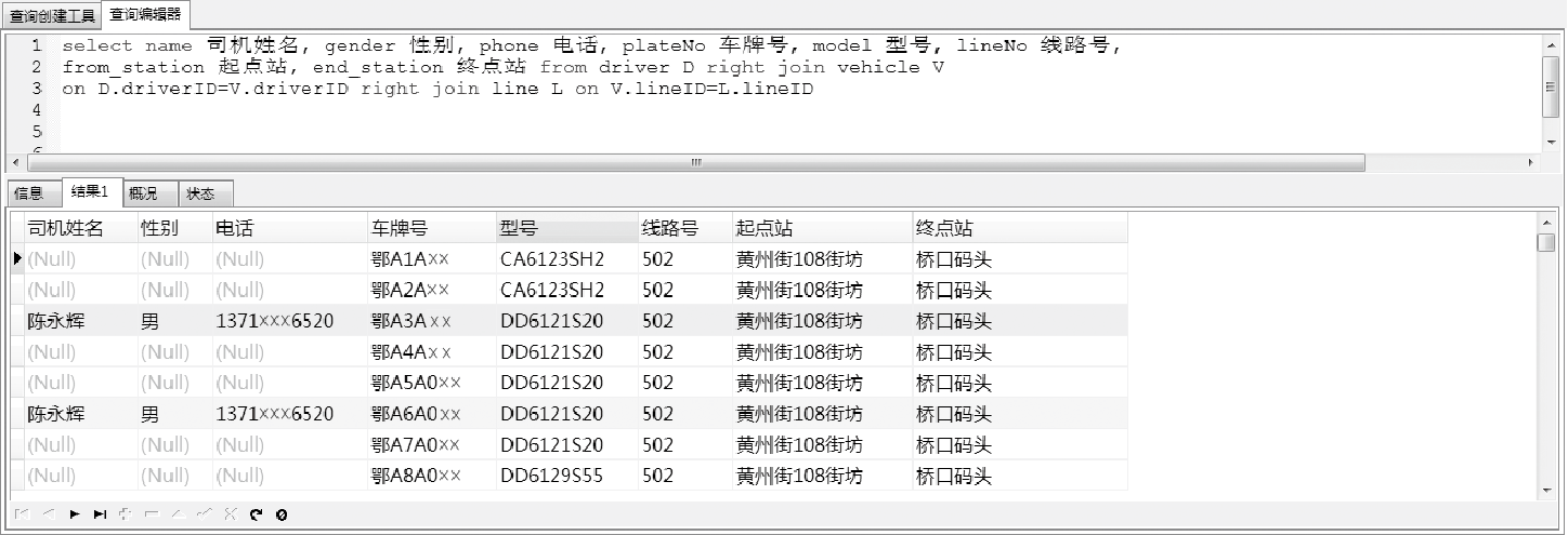 示例:显示所有线路及其所配车辆基本信息,并查询车辆所配司机相关信息,要求输出司机姓名、性别、电话、车牌号、型号、线路号、起点站和终点站。