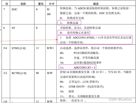 ->等待转换完毕,由于转换完成,则ADCCON1的最高位第七位会被赋值为1,因此通过判断ADCCON1的最高位是否设置为1了,即while(!(ADCCON1&0x80);