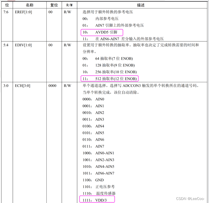 ·EREF[7:6] :选择用于额外转换的参考电压。本例选择AVDD5引脚,该位设为10