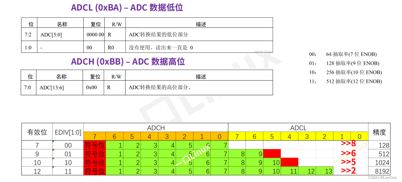 ·ADCH:0到7位对应ADC转换结果的高位部分6到13位