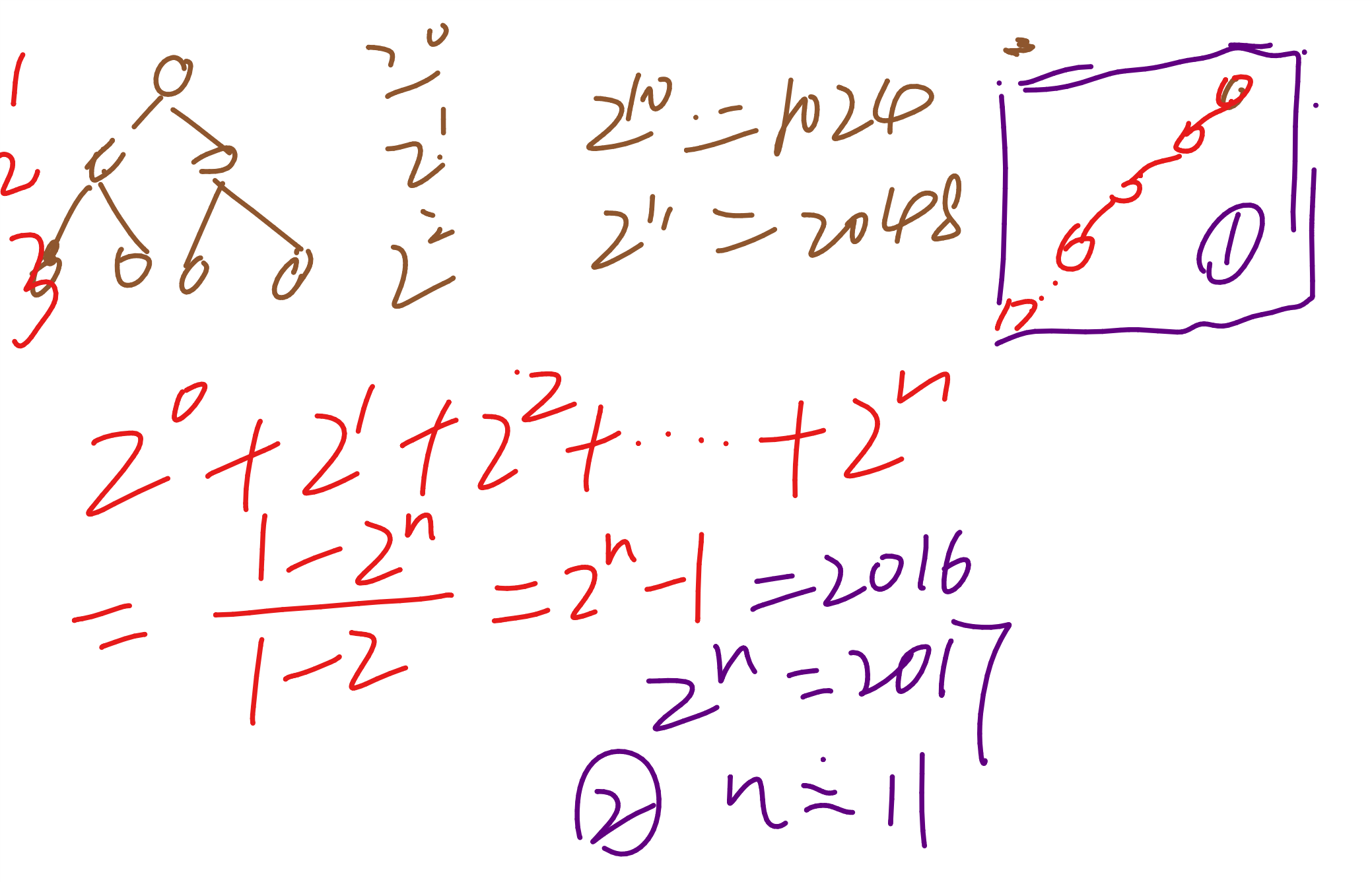 约定二叉树的根节点高度为1,一颗节点数为2016的二叉树最少有 ____1_____个叶子节点;一颗节点数为2016的二叉树最小的高度值为____11_____。