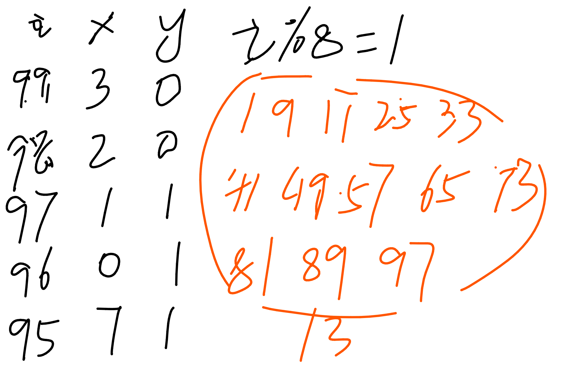 相当于求解的100以内某个数除以8的余数为1的个数。
