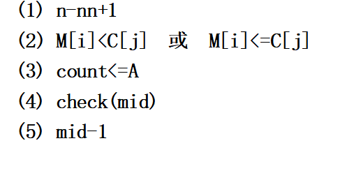 bool check(int nn){int count = 0,i,j;i = ____(1)_____;j = 1;while(i <= n){if(___(2)_______)count += C[j]-M[i];i++;j++;}return ____(3)____;