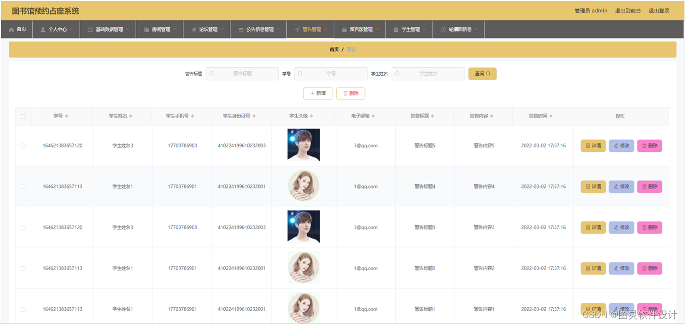 图书馆预约占座系统通过MySQL数据库与Eclipse工具进行开发,图书馆预约占座系统能够实现房间管理,论坛管理,警告管理,留言版管理,学生管理,房间占座管理,基础数据管理等功能。