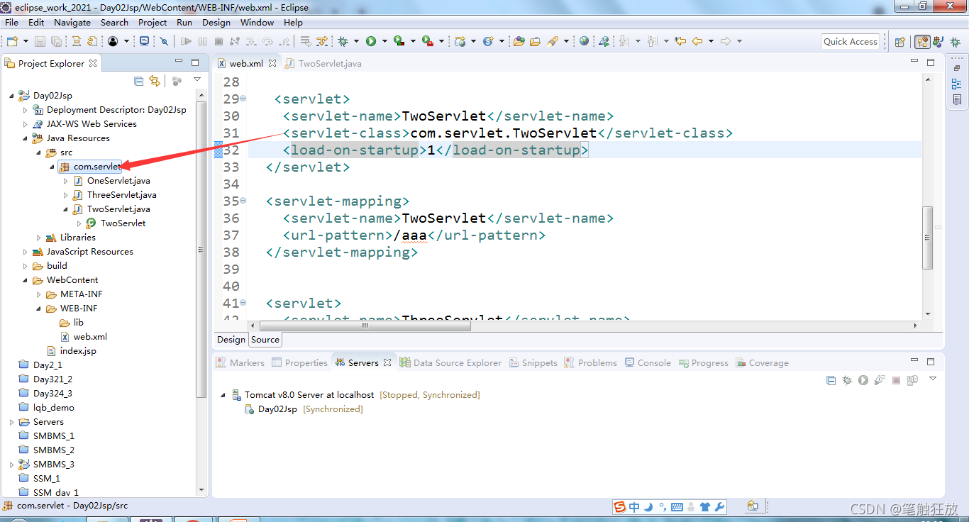 那么我们开始操作代码,来演示一下这个标签的用法,这里我们在TwoServlet的注册上加上这个标签,看看效果: