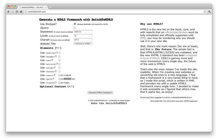 Switch To HTML5 是一个基础而实用的模板生成工具。如果你开始一个新项目,可以到这里获取免费的 HTML5 网站模板。