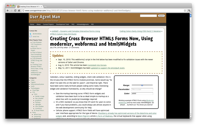 HTML5 中的日历,取色板,滑块部件等都是非常棒工具,但是有些浏览器不支持。这个页面将帮助你构建完美的HTML5表单兼容方案。