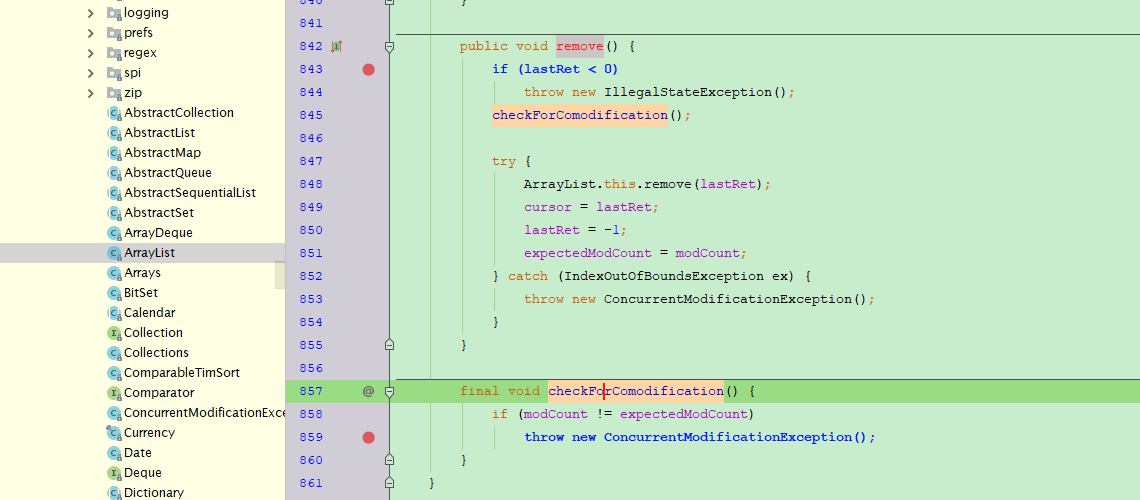 迭代器内部的每次遍历都会记录List内部的modcount当做预期值,然后在每次循环中用预期值与List的成员变量modCount作比较,但是普通list.remove调用的是List的remove,这时modcount++,但是iterator内记录的预期值=并没有变化,所以会报错。