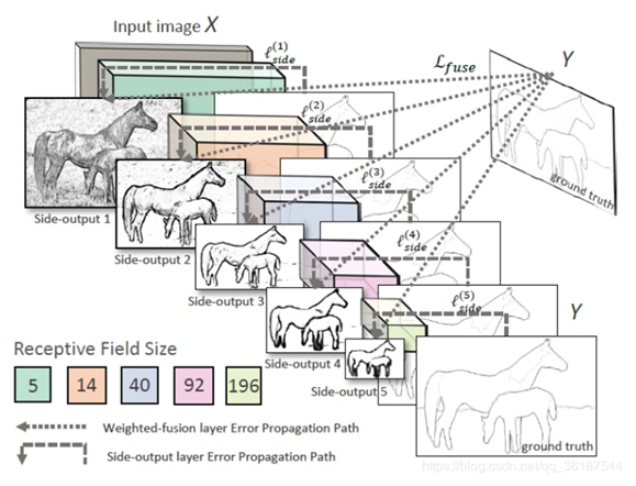 HED 网络是一种多尺度多融合(multi-scale and multi-level feature learning)的网络结构,基于VGG16,原理图如下,不详细解释了: