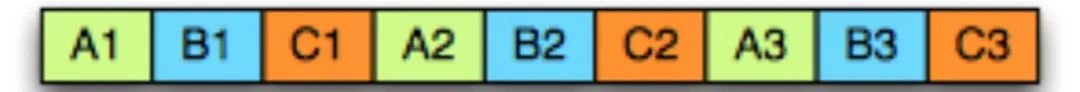 例如,下图是拥有 A/B/C 3 个字段的简单示意表: