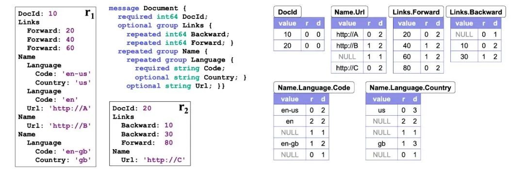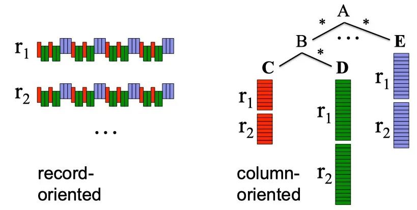 对于嵌套格式列存,除了按列拆分进行连续的存储,还需要能够“无损”的保留嵌套格式的结构化信息,以便正确的重建记录。